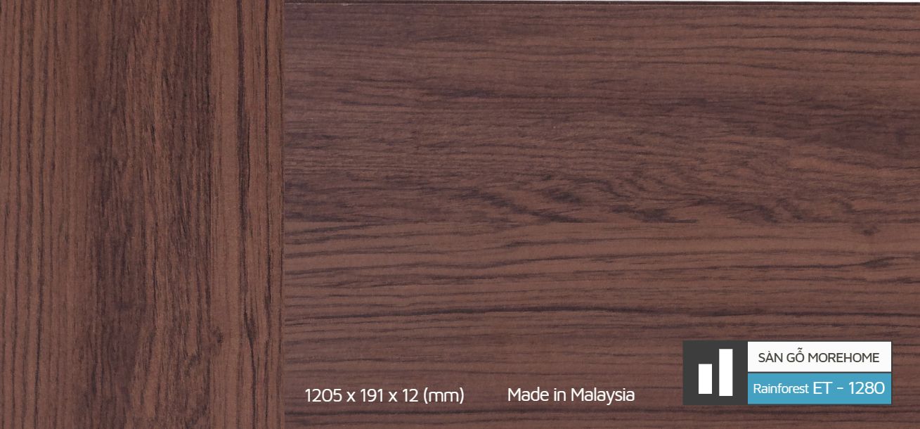Là dòng sàn gỗ công nghiệp cao cấp, được nhập khẩu trực tiếp từ nhà sản xuất tại Malaysia. Sàn gỗ công nghiệp Rainforest ET 1280 là dòng sàn gỗ bản lớn, có độ dày 12mm. mức độ chống mài mòn AC5 sử dụng tốt trong môi trường dân dụng nhà ở gia đình và các công trình công cộng. Sàn gỗ công nghiệp Rainforest Malaysia ET bản lớn, thích hợp sử dụng cho sàn phòng khách, phòng ngủ, bếp.... Sử dụng sàn gỗ công nghiệp Rainforest kết hợp nội thất hiện đại cùng với ánh sáng tự nhiên sẽ càng làm tăng vẻ tinh tế và sang trọng cho không gian sử dụng.