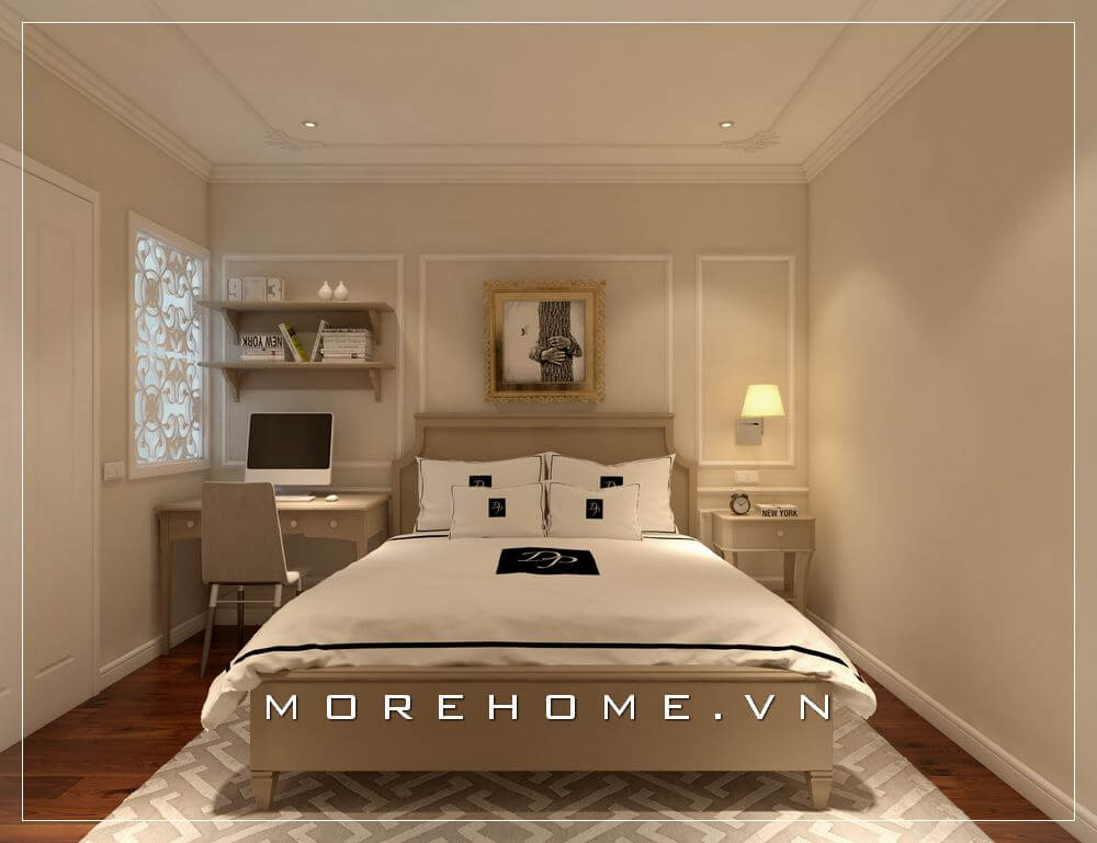 Thiết kế nội thất phòng ngủ tân cổ điển với tone màu vàng kem tạo cảm giác ấm cúng, nhẹ nhàng