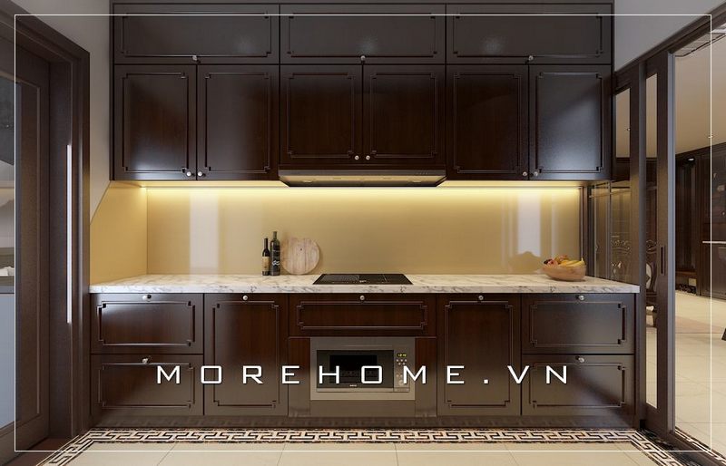 Trang trí phòng bếp ăn gỗ óc chó hiện đại, đẹp, sang trọng