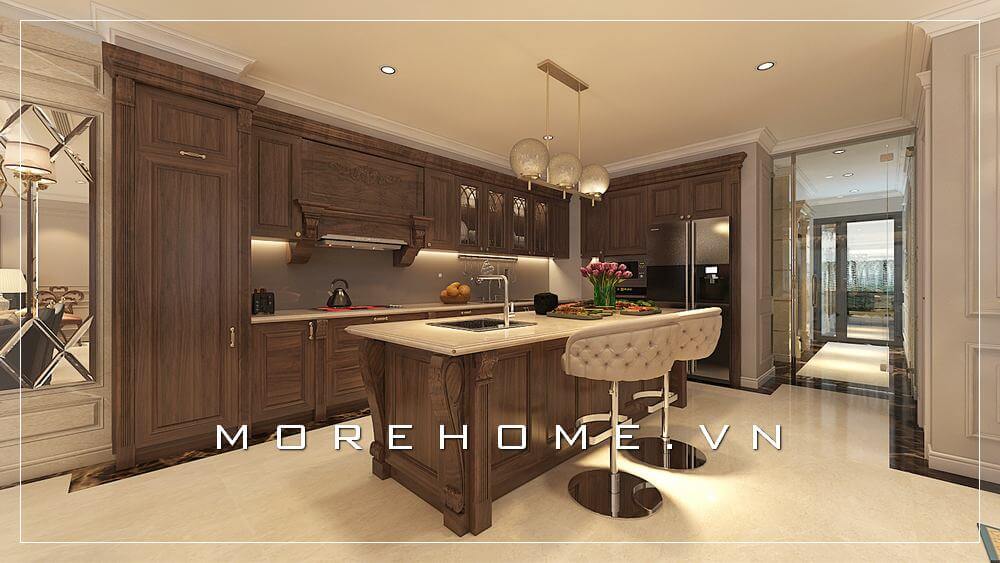 Mẫu tủ bếp gỗ tự nhiên màu nâu trầm cao cấp, đường nét uyển chuyển tân cổ điển giúp không gian phòng bếp nhẹ nhàng, sang trọng và tiện nghi cho người nội trợ